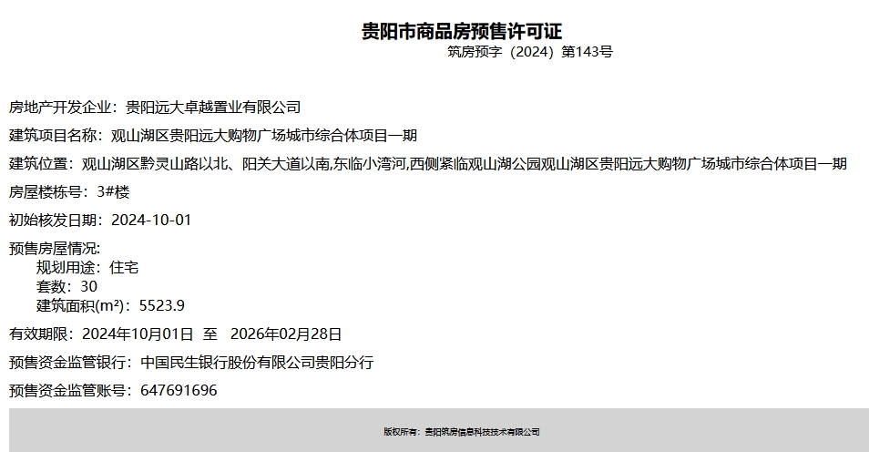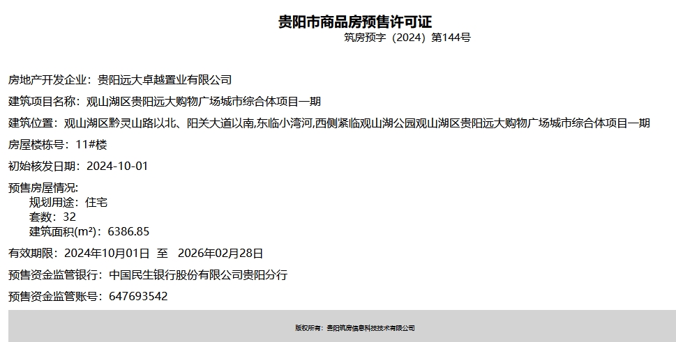 10月10日,据筑房网消息,观山湖区贵阳远大购物广场城市综合体项目一期(推广案名:贵阳远大观山府雲錦)新获两张预售证,3号楼和11号楼共计62套住宅即将入市。